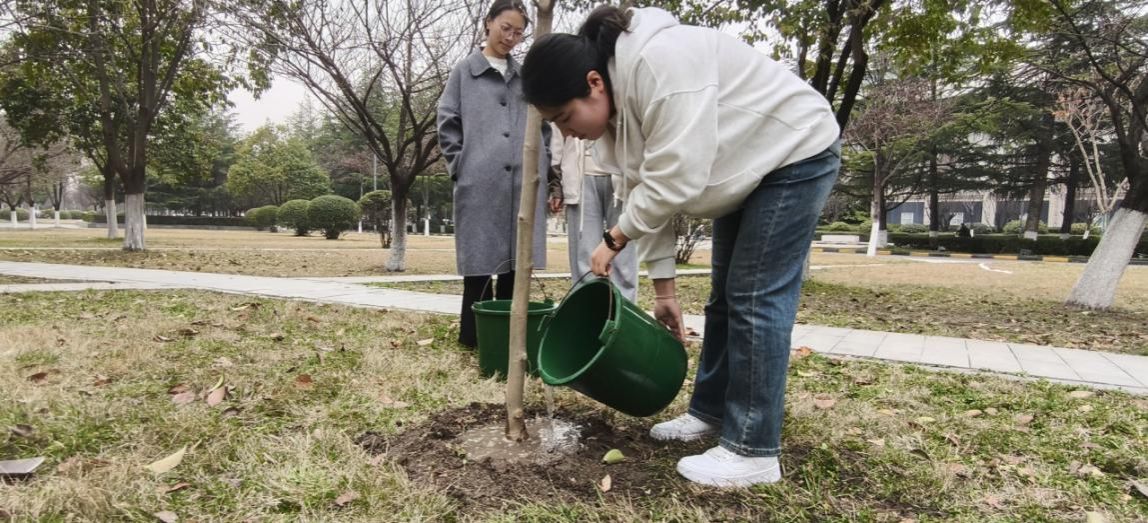 楼北侧开展“以校友林续母校情、话共建行”劳动教育活动。学院党委副书记耿云辉、学工主管刘敏、学院机关党支部成员、2025届毕业生及研一、研二学生代表与学校后勤部老师共二十余人挥锹培土,一起种下“劳育之树”“校友之树”“共建之树”,以劳动实践厚植生态文明理念,为学校增添绿色生机。
