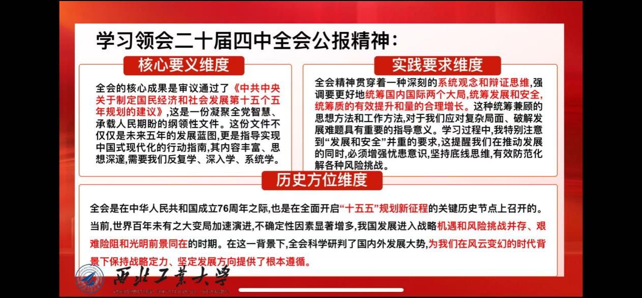 读书会伊始,西北工业大学博士生韩嫣婕围绕党的二十届四中全会公报作分享,从公报概况、内容逻辑、理论实践意义及学习践行四维度展开讲解,详解“六个坚持”指导原则、“七维提升”目标等核心内容。作为马克思主义理论专业博士生,她呼吁各位同学聚焦核心议题深化研究、践行青年担当,以学术自觉回应时代需求,为推进中国式现代化贡献青春力量。
