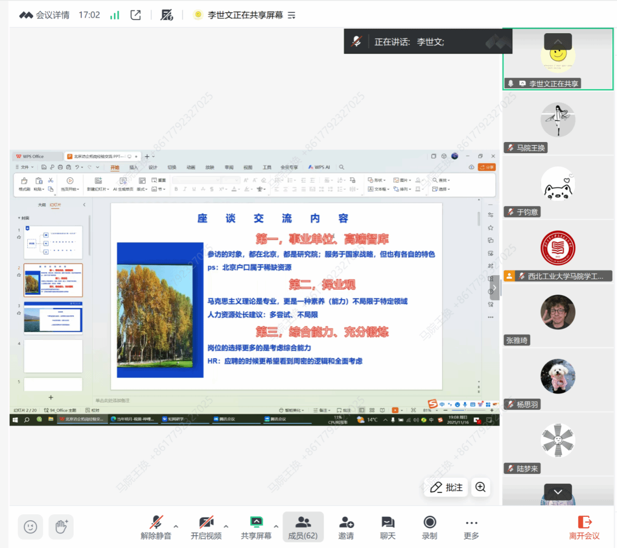 分享会上,六名参与“千名学子进国防”北京实践活动的学生代表,围绕就业选择、能力培养、学科价值等多个方面,分享了各自的访企实践感悟。2022级博士研究生李世文介绍了调研三家单位的基本情况,并结合与各单位人力资源负责人的座谈感受,鼓励同学们拓宽求职视野,打破专业局限,全面提升综合能力。2023级博士研究生沈守涛聚焦国企、央企就业方向,深入解读了行政岗位对复合型人才的需求,鼓励马克思主义理论专业学生树立专业自信,多元拓展就业路径。2023级硕士研究生褚星波阐述了马克思主义理论学科的思维优势,强调扎实的思维能力和坚韧的意志品质是职业发展的重要支撑。2023级硕士研究生刘丽萍结合实践经历,建议同学们积极参与多元活动,提升综合素养,拓宽就业视野,同时精准优化简历,增强求职竞争力。2025级本科生陆梦来分享了专业认知的转变过程,生动展现了文科研究的实践价值,并呼吁新时代青年积极承担网络安全责任。2025级本科生谢建年则强调了细节管理与核心就业能力的重要性,鼓励大家勇于尝试、敢于试错,主动转变学生思维,迅速适应职场环境。