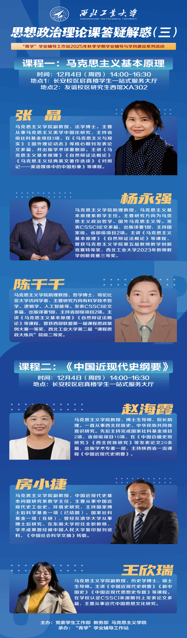本次答疑按课程分四期开展,第一期为《思想道德与法治》课程,第二期为《毛泽东思想和中国特色社会主义理论体系概论》课程,第三期为《马克思主义基本原理》《中国近现代史纲要》课程,第四期为《习近平新时代中国特色社会主义思想概论》课程。目前,本学期答疑工作坊已顺利完成。