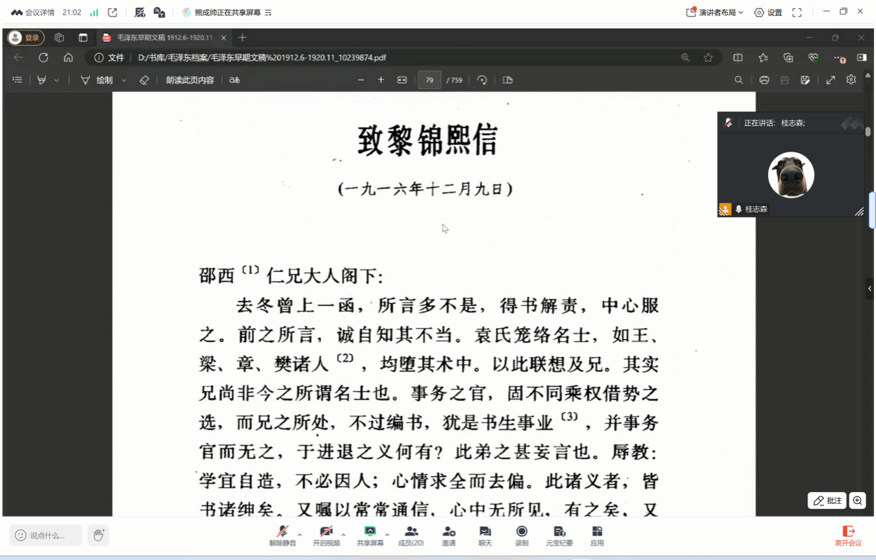 读书会伊始,熊老师和大家讨论了新学期的学习进展和生活情况。随后,熊老师谈到读书会选择阅读《毛泽东早期文稿》的目的,在于理解20世纪初中国青年的思想观念、知识体系以及其青睐社会主义思潮的原因,探讨他们为何积极学习马克思主义并走上革命道路。这一设问为本次研读提供了问题意识。
