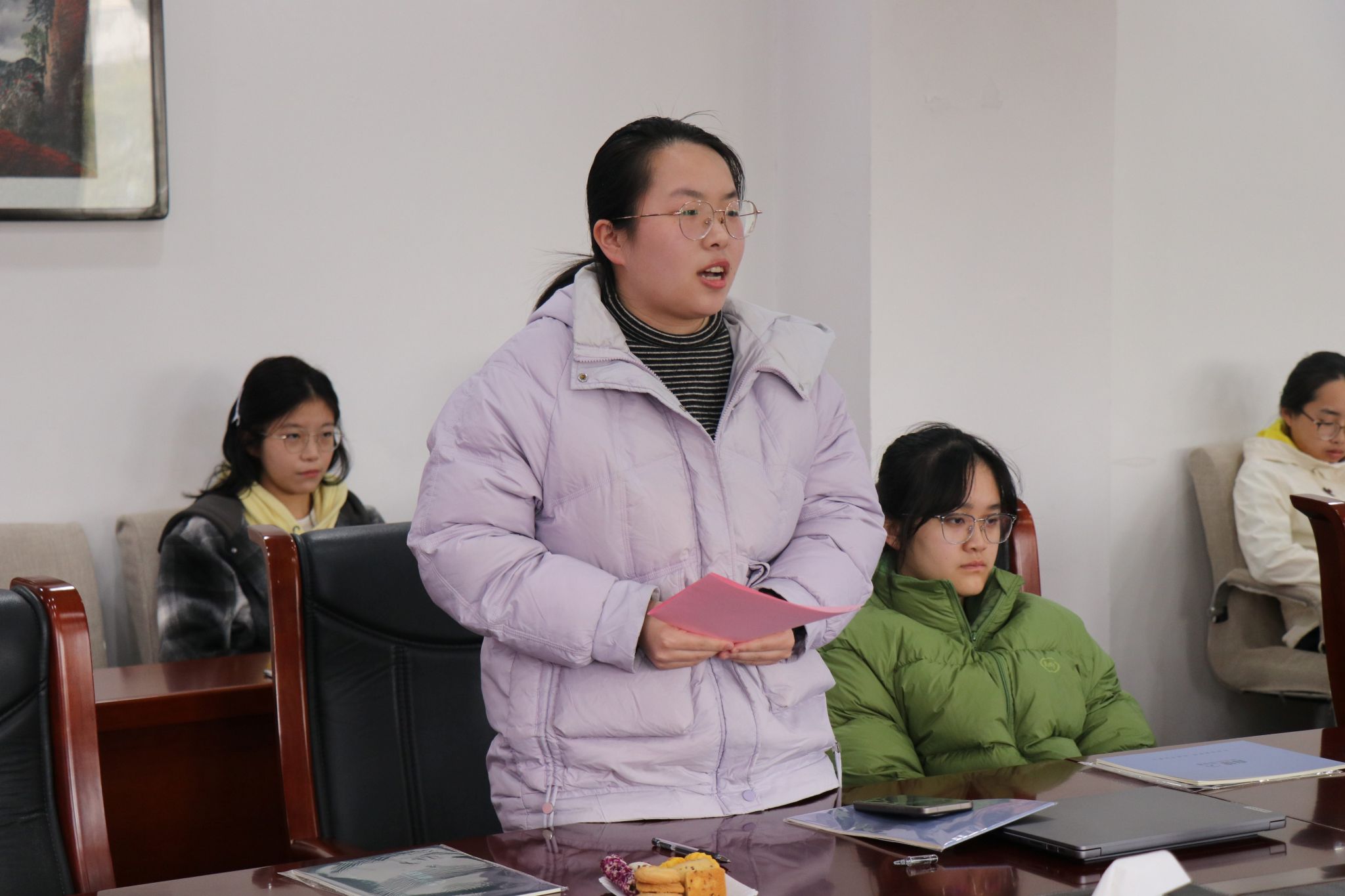 本科生代表发言阶段,徐彬慧、袁蔼玲、董诗琪、冀毓颖四位同学依次发言,向老师和同学们分享了自己入学以来的学习感悟和困惑。与会的各位老师对同学们的疑问一一作出回答。学院领导为同学们发放“每日记录”笔记本,鼓励同学们将每月每周每日的学习计划记录下来,做到日拱一卒、功不唐捐。