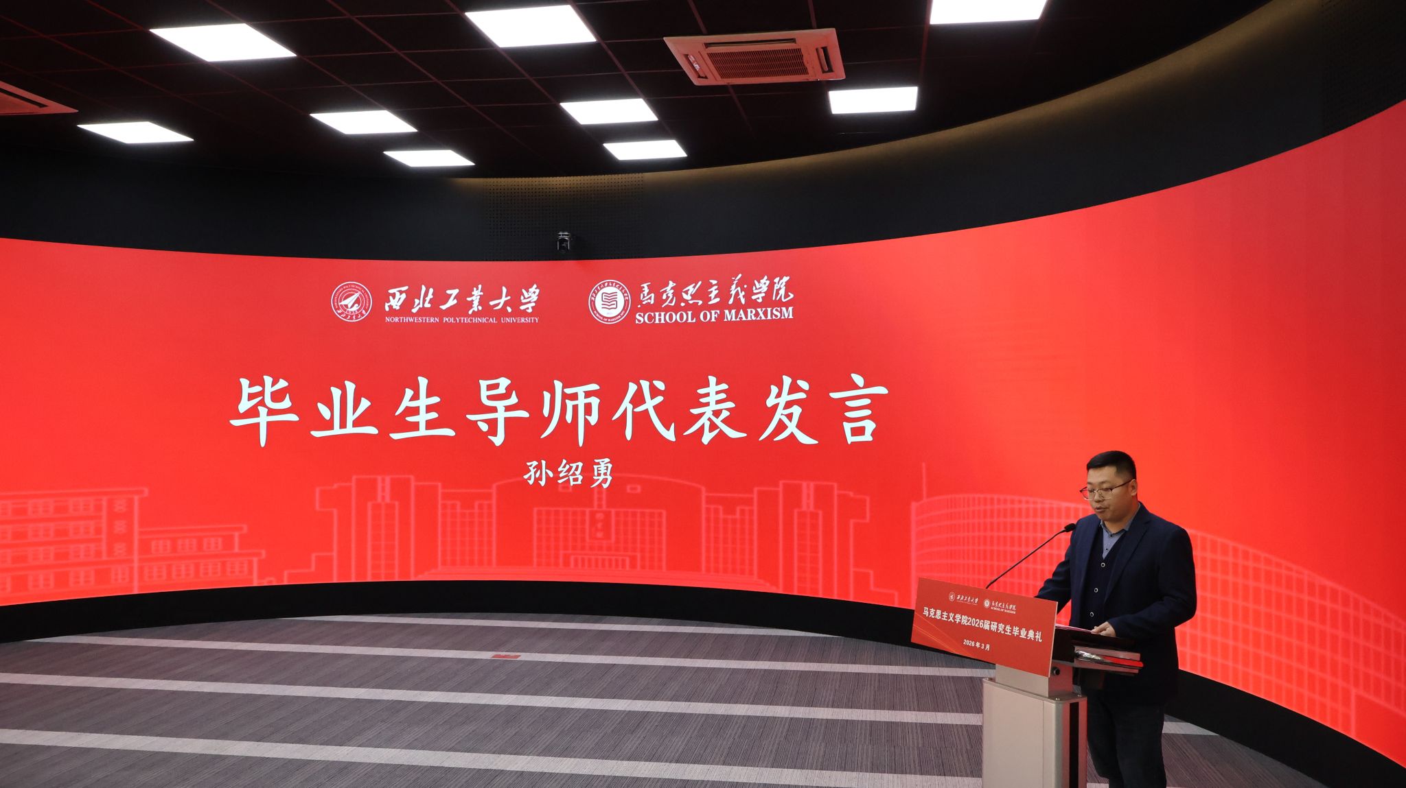 准聘教授孙绍勇作为导师代表致辞,向圆满完成学业的全体毕业生致以热烈祝贺,并致以诚挚祝福、寄予殷切嘱托。