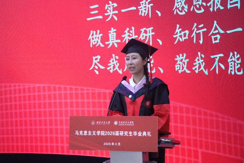 典礼现场,硕士优秀毕业生代表陈宗超、博士优秀毕业生代表石映昕依次发言,结合自身求学经历、学术成长与生活感悟,分享校园收获与毕业期许。