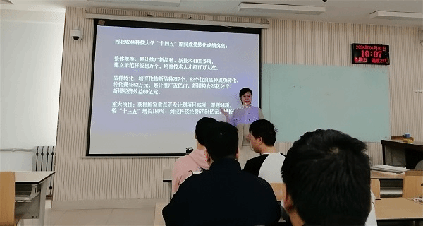 贺苗教授受邀赴西北农林科技大学、西安明德理工学院开展“金课”巡讲,围绕“科技报国的使命担当”展开授课,以当代科技工作者卓越贡献为切入点,深入阐释科技报国的丰富内涵,引导青年学生深刻认识科技自立自强的极端重要性,激励大家在强国建设、民族复兴新征程中勇担时代使命。
